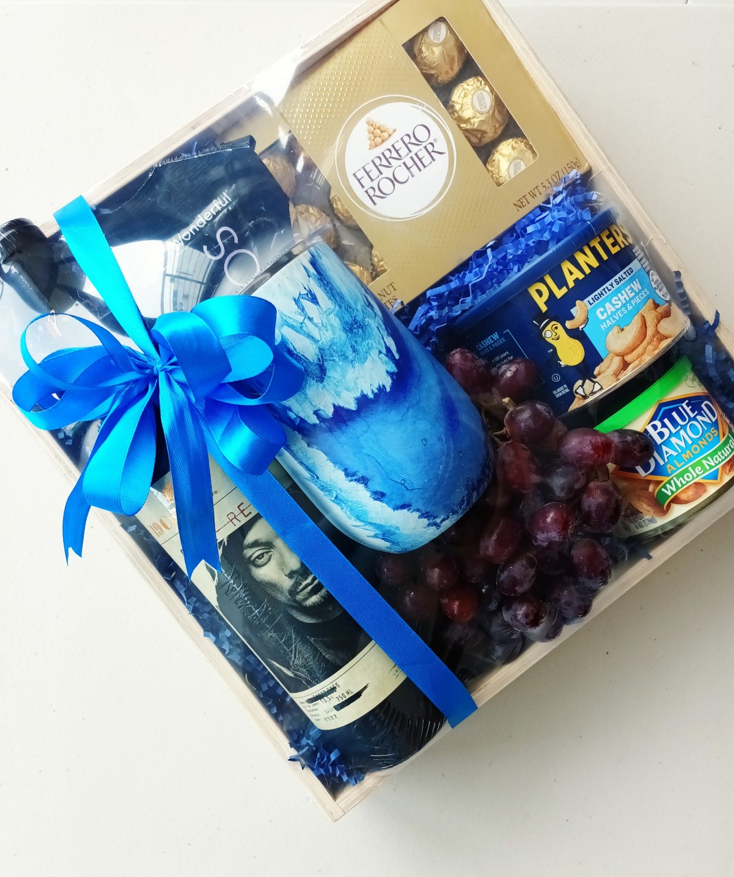 This gift crate packed with premium wine, delicious grapes, chocolates and nuts and perfect for him. Nicely shrink wrapped and tied with a bow, it will certrainly make is day!