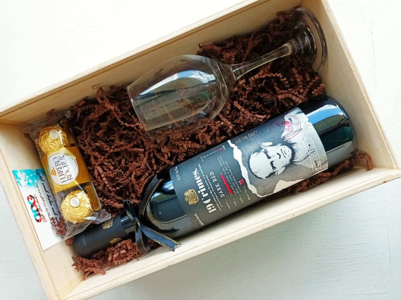 Celebrate in style with our Wine Gift Box, featuring a carefully selected bottle of wine, a elegant wine glass, and decadent chocolates. The perfect combination for a relaxing evening or thoughtful gift, beautifully packaged and ready to impress.